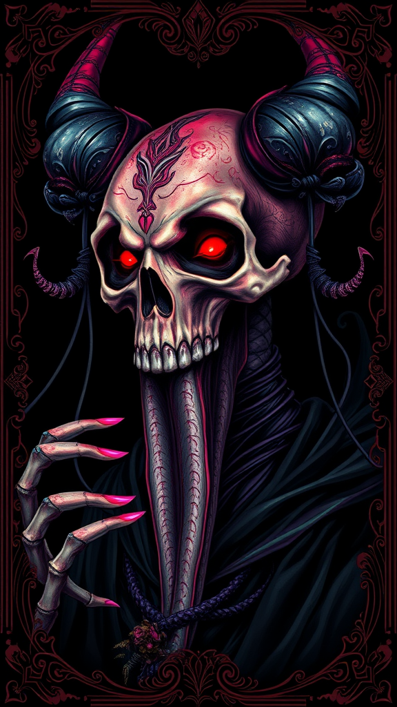 Skull demon sorcerer concept art portrait inspired by Terese Nielsen, Brom, and Miho Hirano, featuring hyperdetailed gothic art with a focus on intricate designs. The piece is set against a dark black background and utilizes triadic colors, reminiscent of a matte painting crafted in Unreal Engine 5. The style is art nouveau, highlighting deep, fantastical colors with complementary contrasts. This gothic fantasy concept art is a masterpiece worthy of DeviantArt, adorned with an ornate border and vivid colors. Displayed in ultra-high definition 16k HDR10 for an astonishing visual experience. The character possesses unique features, including a long neck and extra fingers, contributing to an otherworldly appearance. The composition maintains clarity with careful avoidance of disfigured or mutated traits. Artifacts such as watermarks, logos, and text are excluded, ensuring an immersive and undistracted viewing experience.
