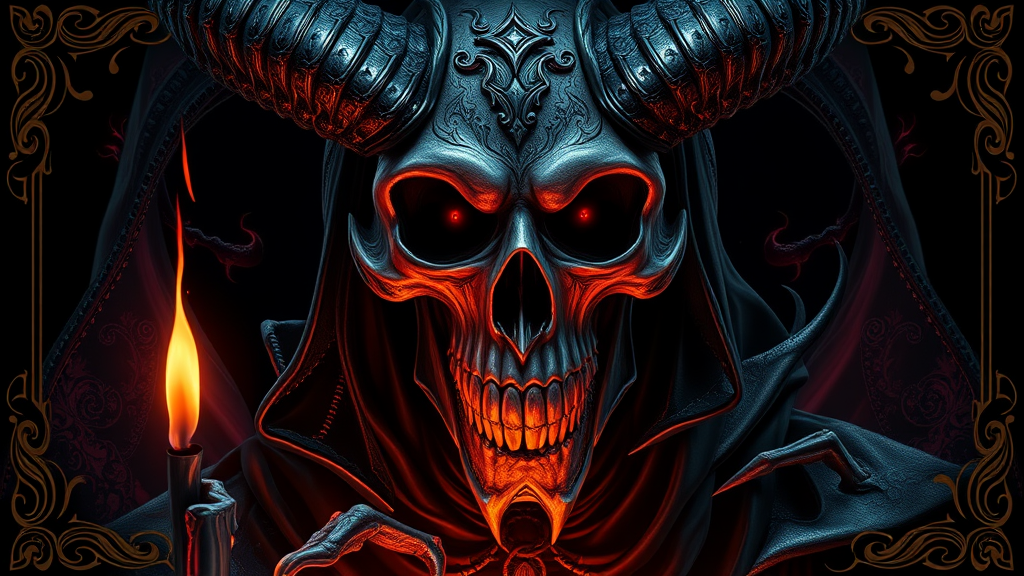 Skull demon sorcerer concept art portrait inspired by Terese Nielsen, Brom, Miho Hirano, featuring hyperdetailed intricately designed gothic elements, trending on Artstation with triadic color palette. Rendered using Unreal Engine 5 in a detailed matte painting style, set against a dark black background with art nouveau influences. Showcasing deep, fantastical colors with intricate detail, suitable for a splash screen and leveraging complementary colors. This fantasy concept art piece is a gothic deviantart masterpiece with an ornate border, vibrant vivid colors, and presented in 16k UHD HDR10 resolution. Highlighted with absurdly high detail, the artwork evokes the Model ReV Animated aesthetic, incorporating creative elements like elongated features, unique distortions, and mutated appendages, resulting in a surreal and otherworldly presence, avoiding common pitfalls such as low resolution, out-of-frame elements, blurriness, and digital imperfections.