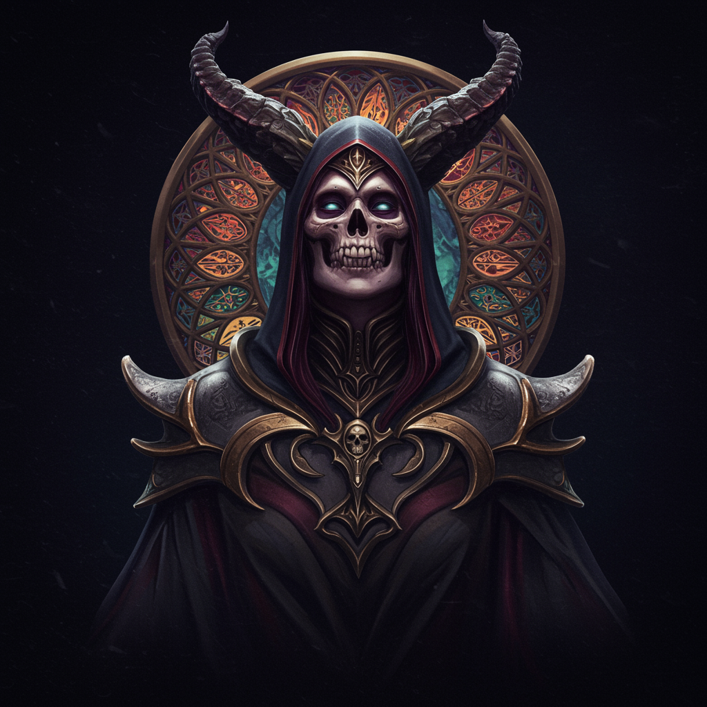 Skull demon sorcerer concept art portrait inspired by Terese Nielsen, Brom, and Miho Hirano, featuring hyperdetailed gothic art in triadic colors, with a dark black velvet background. This fantastical piece is detailed with intricate art nouveau elements, showcasing vivid and deep colors. The scene appears as a splash screen with an Unreal Engine 5 matte painting aesthetic, utilizing complementary colors to highlight its fantasy concept. The figure is a gothic deviantart masterpiece portrayed in 16k, UHD, HDR10 resolution, exhibiting absurd detail and a vivid color palette without any low-resolution artifacts or distractions such as logos or watermarks. The sorcerer is crafted with an air of mystique while maintaining an artistic balance, free of disfigurements or mutations, focusing on elegance and detail.