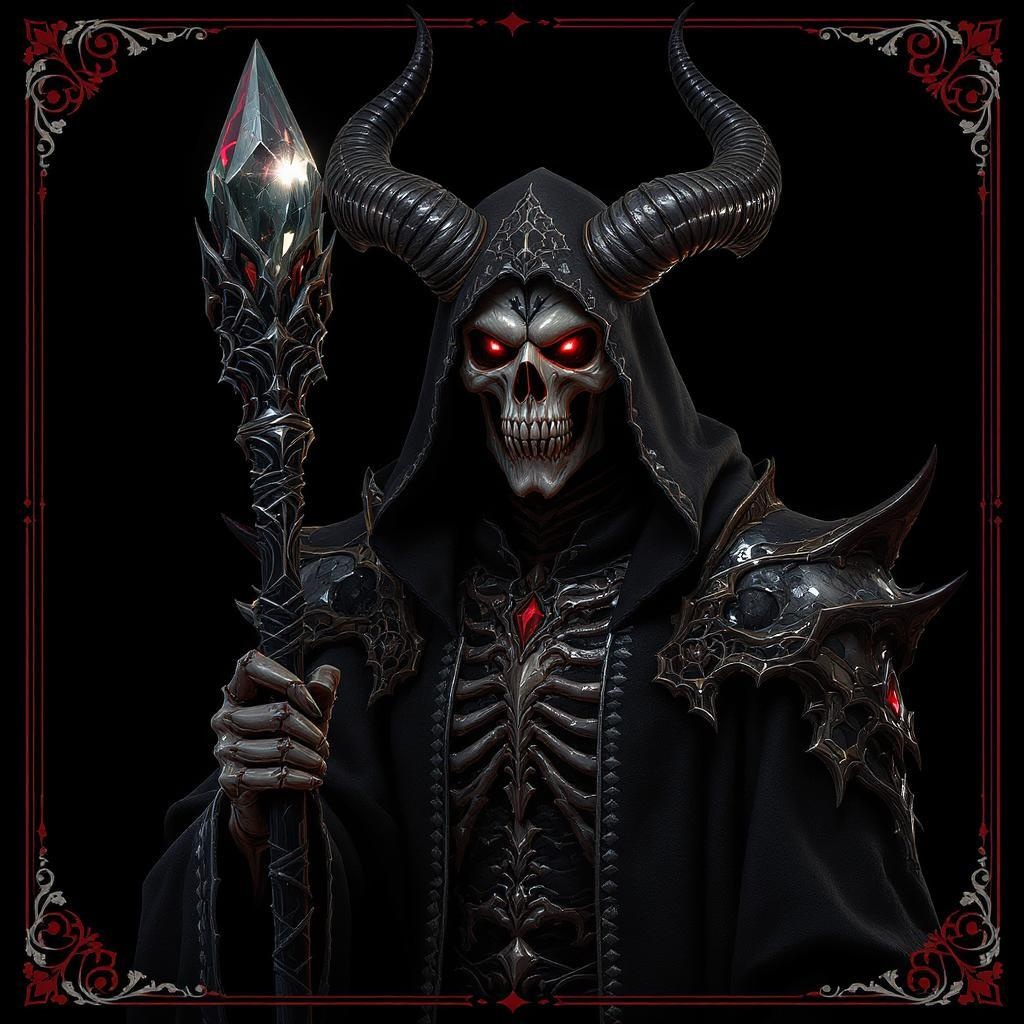 Skull demon sorcerer concept art portrait inspired by Terese Nielsen, Brom, Miho Hirano, featuring hyperdetailed gothic art in triadic colors, crafted in Unreal Engine 5. Set against a dark black backdrop, this intricate art nouveau piece blends vivid and deep colors, creating a fantastical and highly detailed splash screen. Ornate borders and complementary hues characterize this fantasy concept art, embodying a gothic deviantart masterpiece. The image is rendered in 16k UHD and HDR10, showcasing absurd resolutions. Avoid common pitfalls like low resolution, out of frame elements, blurriness, jpeg artifacts, watermarks, logos, text, cropping, cartoonish aspects, and other visual distractions.