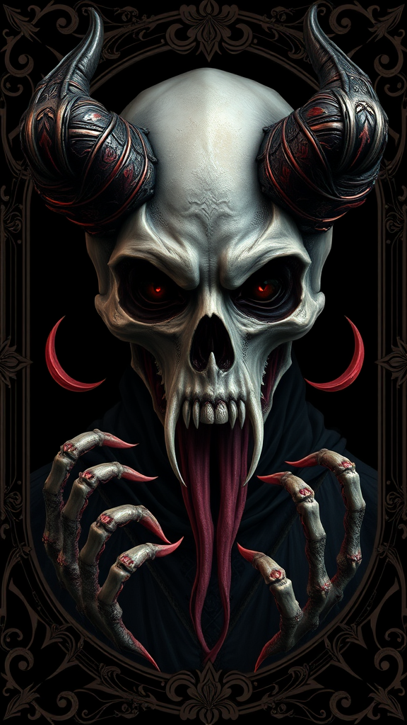 "Skull demon sorcerer concept art portrait inspired by Terese Nielsen, Brom, and Miho Hirano, featuring hyperdetailed intricately detailed gothic art, trending on Artstation with triadic colors. Created in Unreal Engine 5, this detailed matte painting showcases a dark black background, art nouveau elements, and fantastical themes with intricate details. Designed as a splash screen, it uses complementary colors and embodies fantasy concept art and gothic deviantart masterpiece qualities. Surrounded by an ornate border, the artwork bursts with vivid colors in 16k UHD HDR10 quality, displaying absurdres resolution. Features include a cross-eyed appearance, long neck, and extra fingers, with a unique mutated style. The image is clear and free of any out-of-frame elements or distractions such as blurry areas, jpeg artifacts, watermarks, logos, letters, usernames, words, cropping, cartoonish elements, or split images."