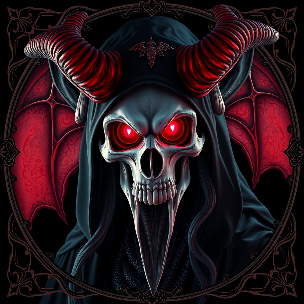 Skull demon sorcerer concept portrait inspired by Terese Nielsen, Brom, Miho Hirano, featuring hyperdetailed gothic art with a triadic color scheme. Created with Unreal Engine 5 as a detailed matte painting, set against a dark black background with art nouveau influences. The piece boasts fantastical and intricate details, designed as a splash screen using complementary colors. A fantasy concept art that stands as a gothic deviantart masterpiece, complete with an ornate border. The artwork showcases vivid colors in 16k resolution with UHD HDR10 quality, achieving an absurdly high resolution. Employs Model ReV Animated version 1. Artistic elements highlight a mystical aura, portraying elongated, otherworldly features without deformities. Maintains a focus on clarity by avoiding lowres elements, and ensures the absence of out-of-frame elements, blurriness, jpeg artifacts, watermarks, logos, or text distractions. Efforts are made to preserve the immersive fantasy experience without any alterations that detract from the original vision.