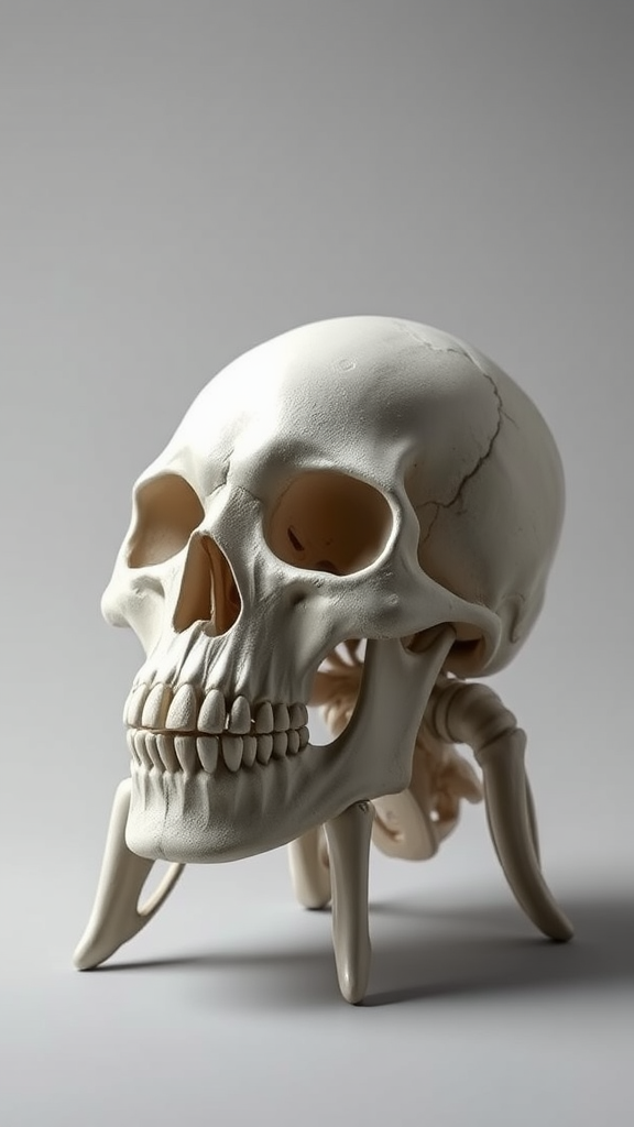 Skull-inspired chair design merging the minimalist principles of Dieter Rams, the organic architectural flow of Frank Lloyd Wright, the playful functionality of Achille Castiglioni, and the futuristic vision of Syd Mead. The chair boasts a sleek, ergonomic form with integrated support, using high-grade materials to mimic bone texture, featuring a sculptural aesthetic that balances eerie elegance and modern sophistication, subtly enhancing comfort and usability.