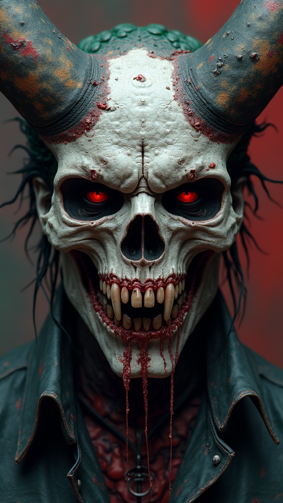 Skull joker demon concept art portrait by Casey Weldon, Olga Kvasha, Miho Hirano, hyperdetailed, intricately detailed gothic art, trending on Artstation, triadic colors, Unreal Engine 5, detailed matte painting, rich color palette, fantastical, complex detail, splash screen, complementary hues, fantasy concept art, 8k resolution, gothic deviantart masterpiece, UHD, HDR, character model, surreal duplication, distorted features, mutations, elongated neck, additional fingers, altered hands, blurred elements, abstract shapes, disfigured structure, no frame constraints, softened focus, image clarity maintained, without text, seamless blend of elements.
