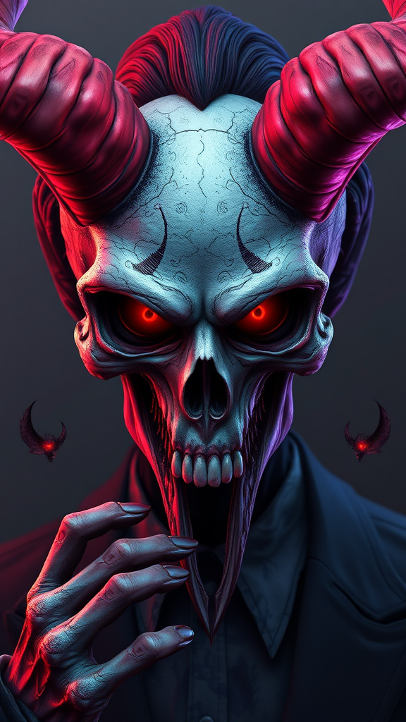 Skull joker demon concept art portrait inspired by Casey Weldon, Olga Kvasha, and Miho Hirano, featuring hyperdetailed, intricately detailed gothic art in a triadic color scheme. Utilizing Unreal Engine 5 for a detailed matte painting with deep colors, the piece is fantastical and intricately detailed, ideal for a splash screen. Incorporating complementary colors, this fantasy concept art aims for an 8k resolution in a gothic deviantart masterpiece with UHD and HDR quality. The design includes elements like duplicates, mutations, disfigured forms, and deformed, cloned faces with cross-eyed features, elongated neck, extra fingers, and mutated hands, maintaining a cohesive artistic vision. Exclusions involve low resolution, out-of-frame elements, blurriness, jpeg artifacts, watermarks, logos, text, usernames, words, cropped or cartoonish aspects, and split images.