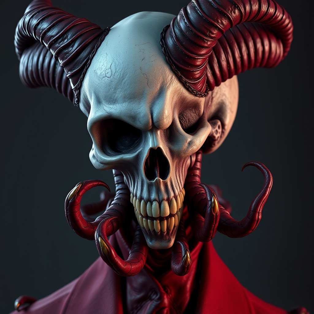Skull joker demon concept art portrait inspired by the styles of Casey Weldon, Olga Kvasha, and Miho Hirano, featuring hyperdetailed gothic art with intricate details, trending on Artstation. Utilizes triadic and complementary colors, rendered in Unreal Engine 5, with a focus on deep, fantastical color, and intricate detailing akin to a splash screen. Embraces fantasy concept art elements in 8k resolution, creating a gothic masterpiece suitable for DeviantArt. The depiction showcases a mutated form with unique attributes like a cloned face, long neck, extra fingers, and vivid disfigurement, avoiding low-resolution, out-of-frame issues, blurred sections, or disturbances like jpeg artifacts, watermarks, or logos. The portrait remains a cohesive, artful creation, celebrating the blend of gothic and fantastical themes.