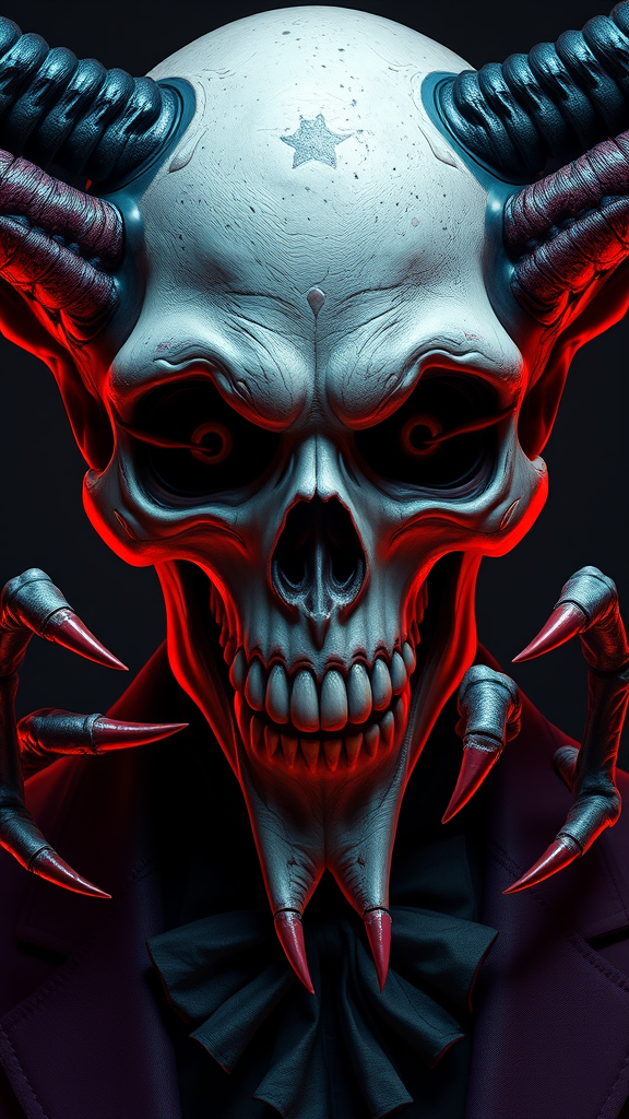 Skull joker demon concept art portrait inspired by Casey Weldon, Olga Kvasha, and Miho Hirano, featuring hyperdetailed, intricately detailed gothic art that is trending on Artstation. This piece employs triadic colors and is rendered in Unreal Engine 5 as a detailed matte painting. It showcases deep colors, fantastical and intricate detail appropriate for a splash screen, utilizing complementary colors. The work stands as a fantasy concept art masterpiece in 8k resolution, capturing a gothic DeviantArt aesthetic in UHD, HDR. The model, Jim EIDOMODE, is depicted with creative elements that include a duplicate or mutated appearance characterized by cross-eyed features, an elongated neck, and extra fingers. This imaginative portrayal avoids low resolution, out-of-frame elements, blurriness, jpeg artifacts, and any extraneous logos or watermarks, ensuring a cohesive and uncropped final piece.