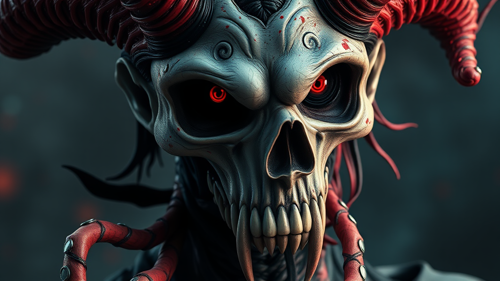 skull joker demon portrait inspired by Casey Weldon, Olga Kvasha, Miho Hirano, featuring hyperdetailed and intricately gothic art. The artwork employs triadic colors with a focus on Unreal Engine 5's capabilities, creating a detailed matte painting with deep, fantastical colors. The portrait showcases complementary colors and is designed as fantasy concept art in 8k resolution. It resembles a gothic deviantart masterpiece with UHD and HDR quality. The model, EIDOMODE, has distinct features like a disfigured and mutated appearance, with a long neck, extra fingers, and cloned face elements. The narrative evokes a dark fantasy theme while maintaining high detail and avoiding lower resolution issues such as blurry images, jpeg artifacts, and distracting elements like logos or text.