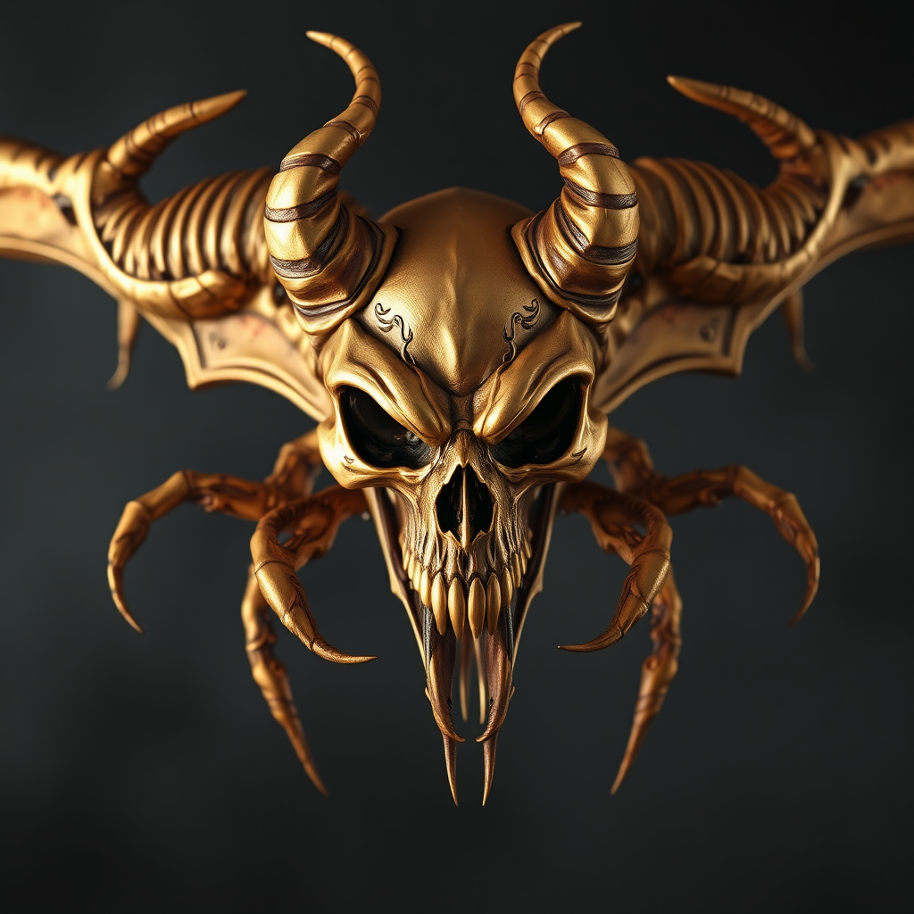 Skull joker demon with an ultra-wide angle view set against a dark, epic background; featuring a gorgeous lifelike golden design with cinematic flair. The focus is on insane intricate and hyper-detailed elements, showcasing poorly drawn, wrong, and bad anatomy. There are elements of mutation with extra and missing limbs, including floating and disconnected limbs, and mutations rendering the form ugly and disgusting. The image is characterized by a sense of blur and disjointed amputation.