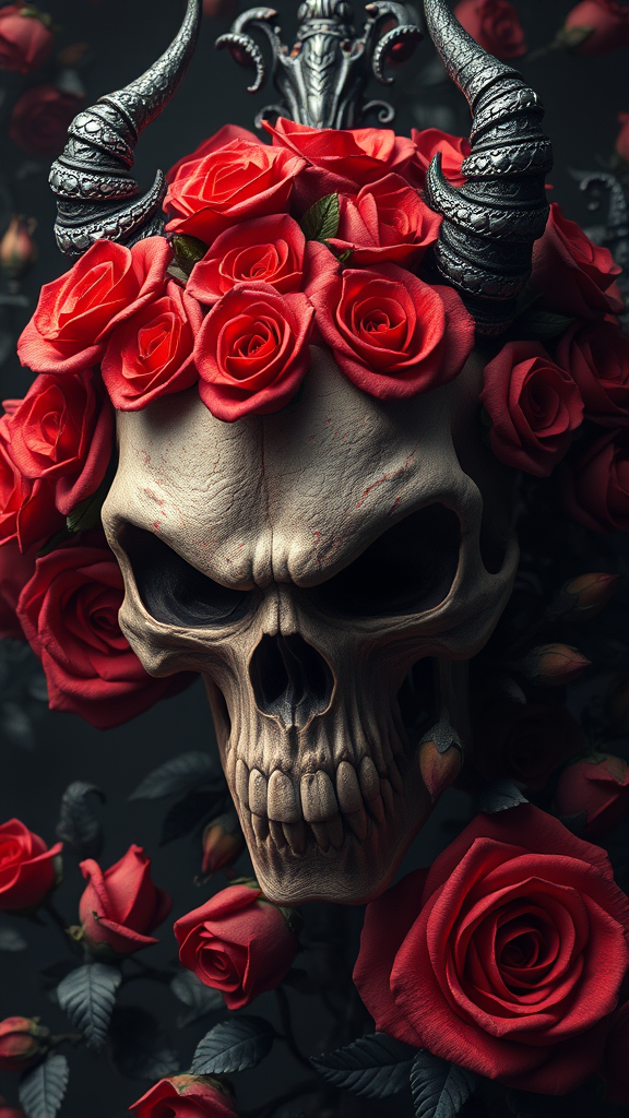 Skull made of red roses, organic horror, devilish essence, intertwining death theme, inspired by H.R. Giger, epic baroque art nouveau, in the style of James Jean, photorealistic render utilizing 3ds Max and V-Ray, showcasing extreme detail and intricacy with a centered composition, elegance exuding through VFX, employing Unreal Engine 5 and Octane Render, high contrast with sharp lines, influenced by Anime and Manga styles, digital art with glowing effects, a blend of hand-drawn and rendered techniques, 8k resolution using Octane Render, Cinema 4D, and Blender, atmospheric and dark with 4k ultra detail, cinematic and sensual, maintaining sharp focus for a hyperrealistic portrayal, humorous undertones within a masterpiece framework, utilizing vivid colors and 3D rendering techniques, concept art trending on ArtStation, touched by the talents of Ed Blinkey, Atey Ghailan, and Studio Ghibli, with inspirations from Jeremy Mann, Greg Manchess, and Antonio Moro, trending on CGSociety, embracing intricate detail and high focus, delivering a dramatic, photorealistic painting art aesthetic by Midjourney and Greg Rutkowski.