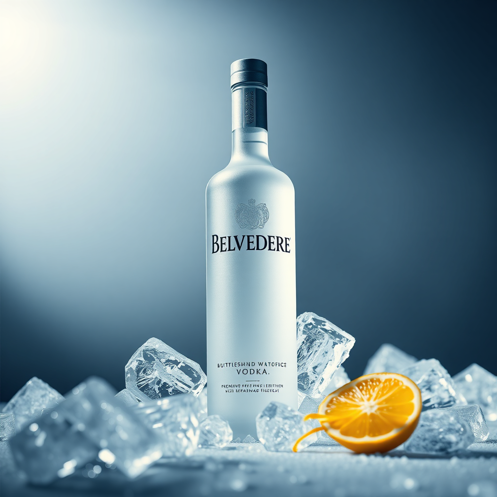 Sleek and elegant photo of Belvedere Vodka bottle set against a backdrop of shimmering ice crystals and soft, ambient lighting, evoking a sense of luxury and sophistication. The vodka bottle is positioned slightly off-center to create a dynamic composition, highlighting its signature frosted glass and iconic logo. In the foreground, a subtle hint of citrus zest adds a touch of zest and freshness, while the background fades into a cool, muted gradient that captures the essence of a crisp, refreshing experience. The overall mood is premium and inviting, enticing viewers to indulge in the refined world of Belvedere Vodka.