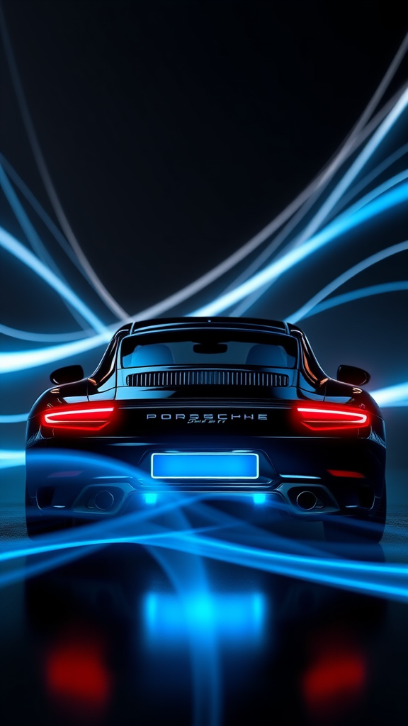 Sleek backlit Porsche 911 in a mesmerizing blend of black, white, and blue. This 3D abstract digital masterpiece features fluid curves and sharp lines, enhanced by depth of field and advanced shaders. Rendered with RTX and CGI technology, the scene is enveloped in volumetric light, creating a stunning visual effect. Use of octane render adds a layer of realism, perfect for a dynamic wallpaper. The aspect ratio is 16:9, with a focus on high quality and slight artistic chaos for an avant-garde touch.