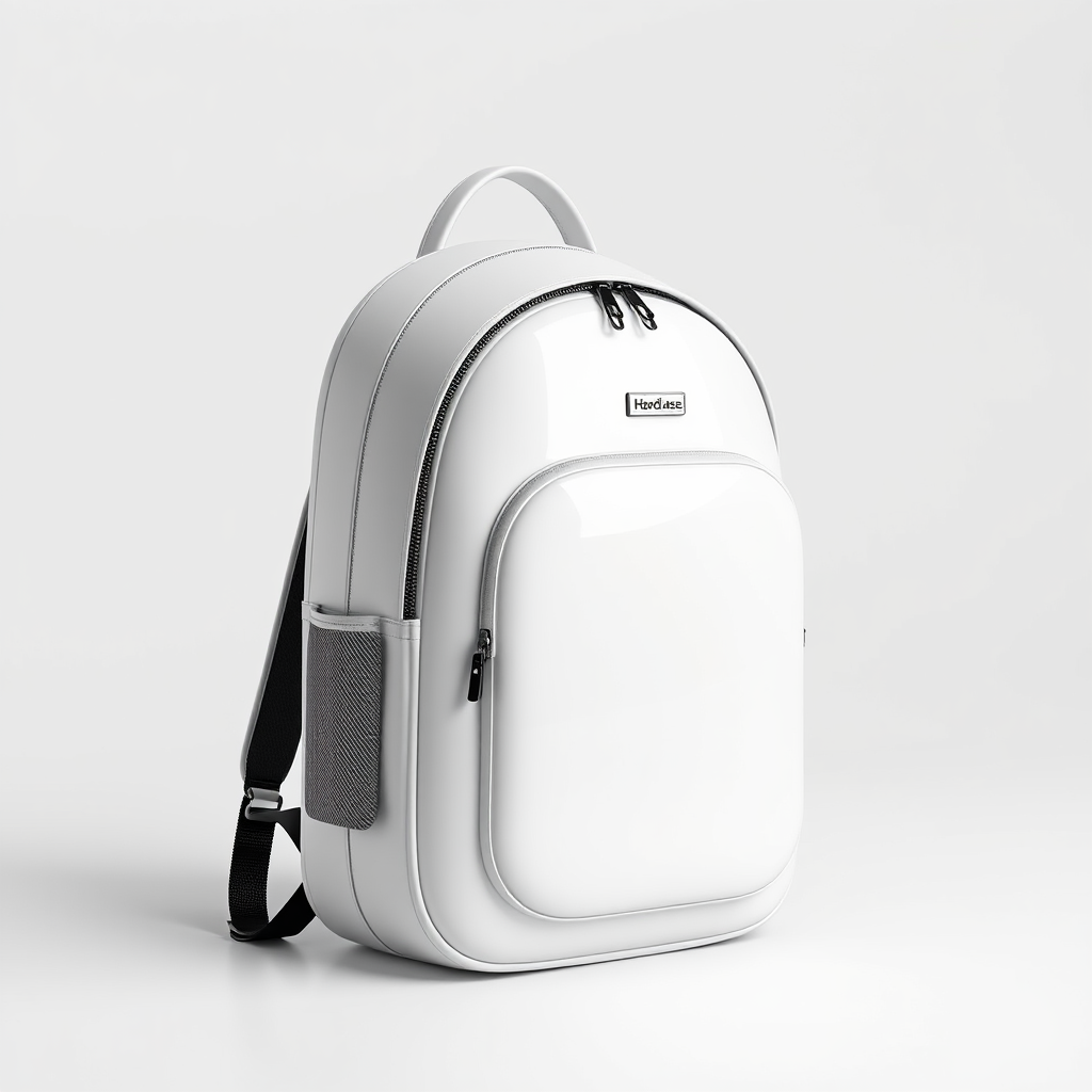 Sleek capsule-shaped white backpack with a hardcase design, inspired by urban stormtrooper aesthetics, featuring clean lines and minimalist detailing. The 4K octane render showcases its intricate and detailed texture, blending principles of Dieter Rams and Apple's design philosophy.