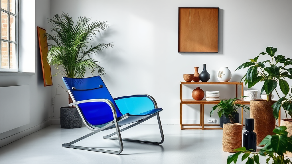 Sleek contemporary chair in a minimalist studio environment, captured through a 90mm lens, featuring a blend of brushed steel and vibrant colored glass textures, accented with lush greenery and a curated selection of artful objects.