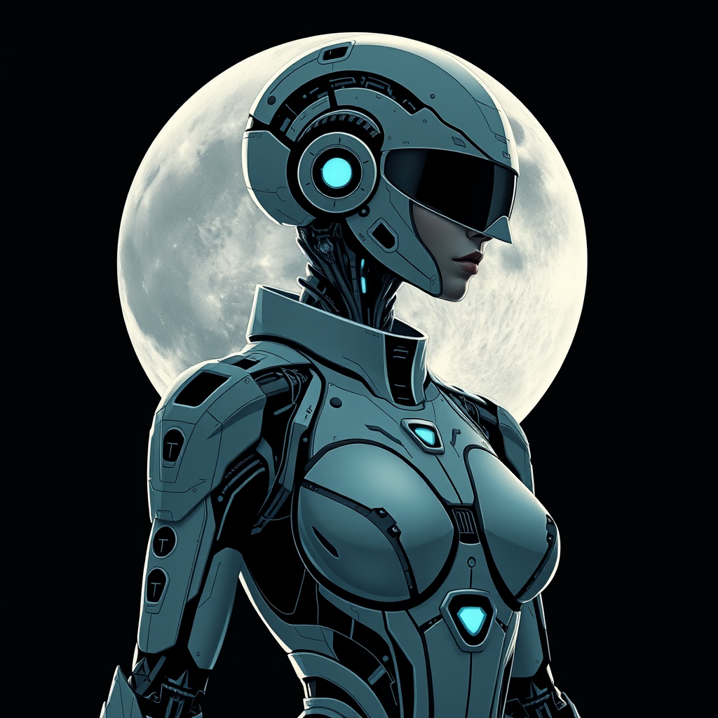 Sleek cyborg woman silhouette in high detail, depicting a futuristic moon knight, adorned with intricate android features, styled as a sci-fi movie poster; a striking figure in a futuristic space suit showcasing cyberpunk aesthetics, blending elegance with advanced technology.