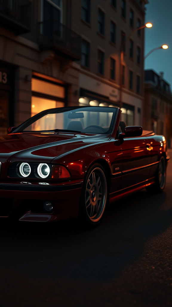 Sleek dark crimson BMW E39 M5 convertible gliding through the dim evening, its piercing angel eyes casting a dramatic glow, captured in cinematic hyper realism with meticulous detail, 8k resolution, surrounded by the subtle mystery of a shadowy urban backdrop.