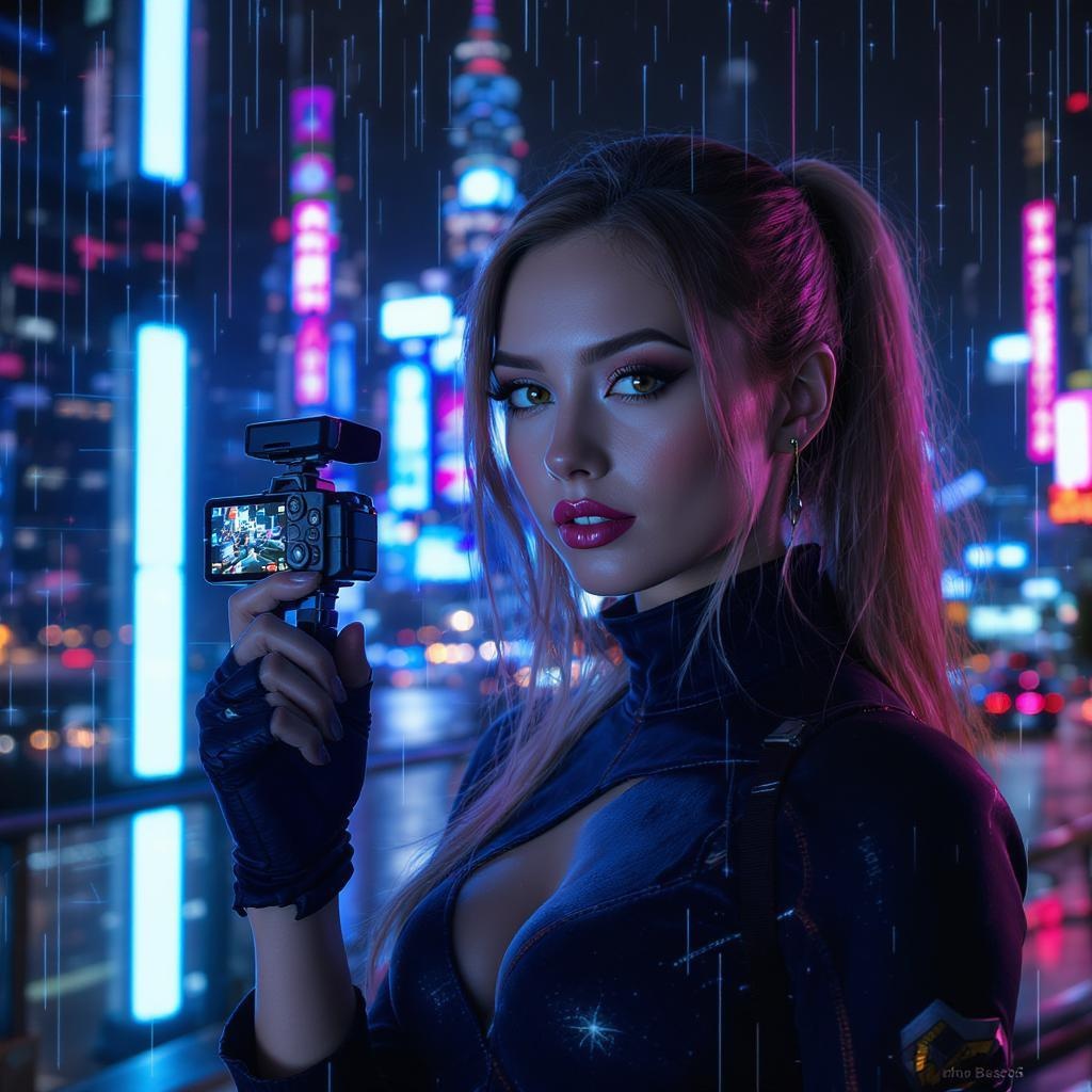 Sleek digital camera. Futuristic skyline. Vibrant neon glow. Cinematic vibe. Thoughtful lighting. Advanced digital enhancements. Female protagonist. Supreme definition. Hyper-detailed. Sci-fi metropolis.
