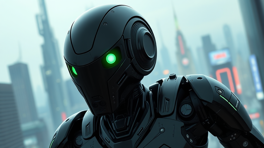 Sleek ebony automaton with glowing emerald eyes navigating through a futuristic cityscape.