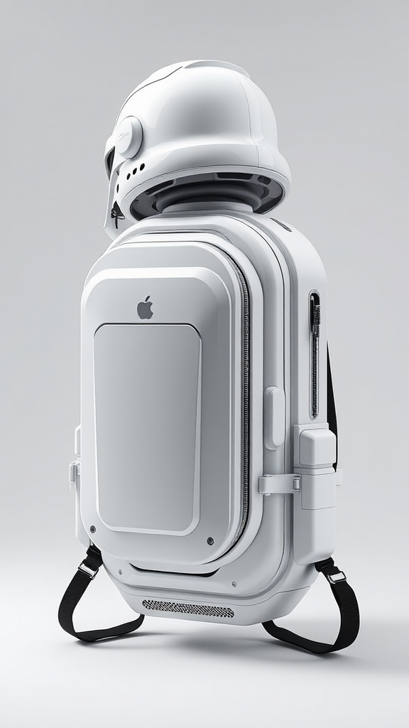 Sleek futuristic capsule-shaped backpack hardcase in pristine white, reminiscent of an urban stormtrooper with elements of minimalistic design inspired by Dieter Rams and Apple aesthetics, intricately detailed with a 4K octane render clarity against a plain background, featuring advanced textures and innovative functional detailing.