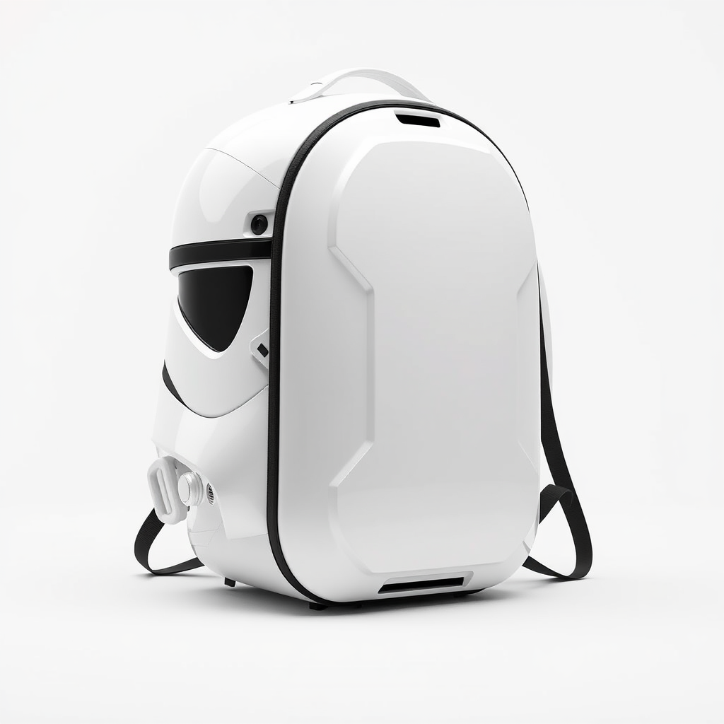 Sleek hardcase pod-shaped white backpack futuristic stormtrooper aesthetic, minimalist product design render on white backdrop, 4K octane render showcasing complex, detailed texture, inspired by Dieter Rams and Apple design philosophy, with creative subtle color accents and a slightly curved ergonomic contour for enhanced urban utility.