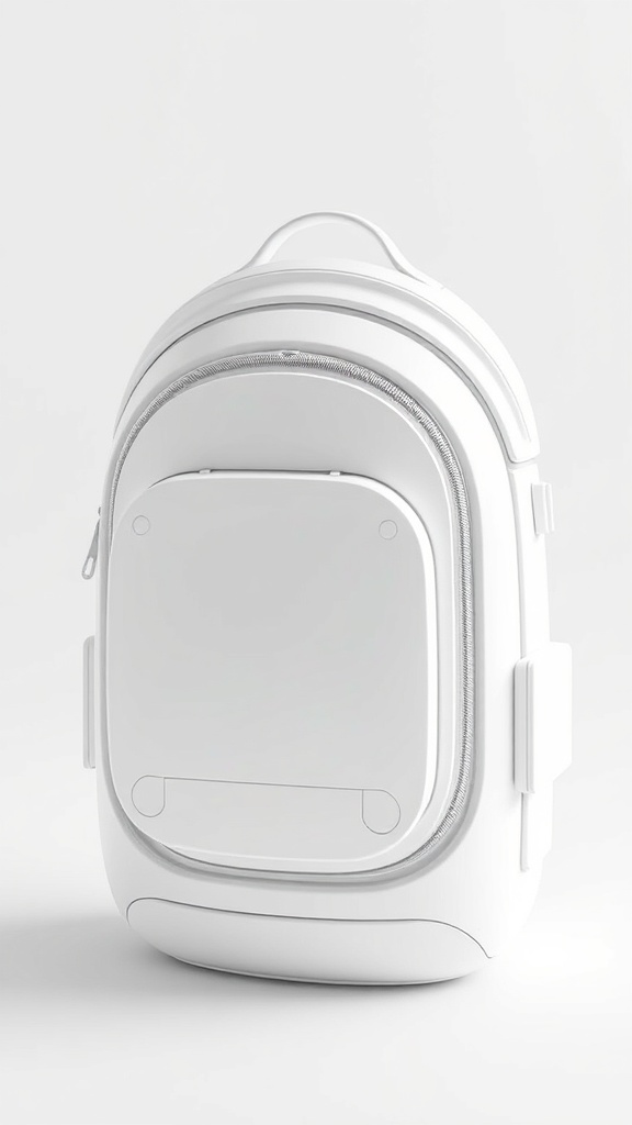 View this AI-generated image featuring sleek rounded hard shell capsule shaped backpack in pristine white channeling the urban stormtrooper aesthetic a study in minimalist elegance the design incorporates intricate and detailed textures reminiscent of dieter rams influence on apple products rendered