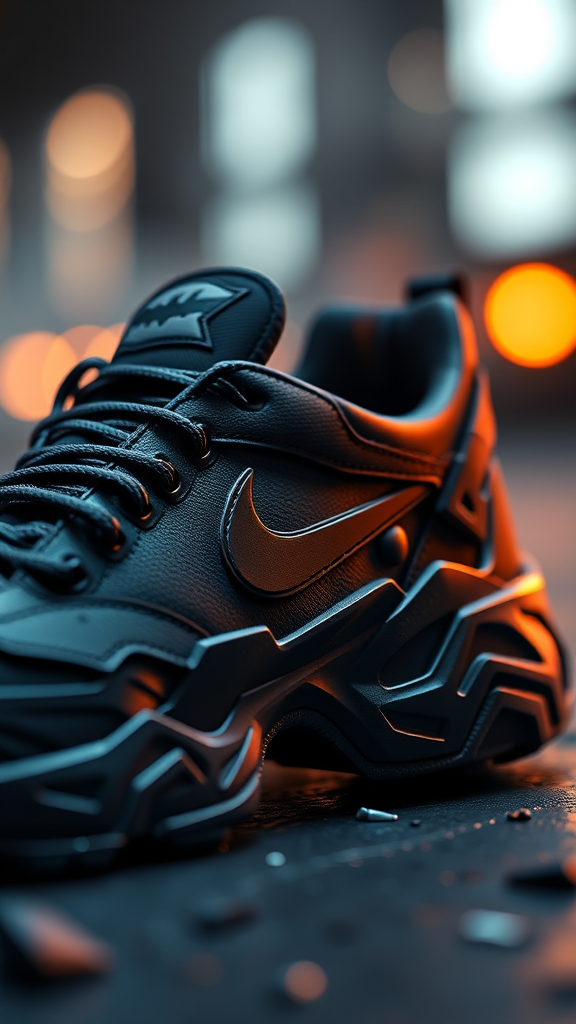Sleek sneaker design inspired by Nike and Batman, featuring intricate details and futuristic elements, with high-definition textures and an ultra-modern aesthetic, capturing the essence of Gotham's Dark Knight in every contour and stitch, set in a stunning 8k resolution aspect with a 4:5 ratio.