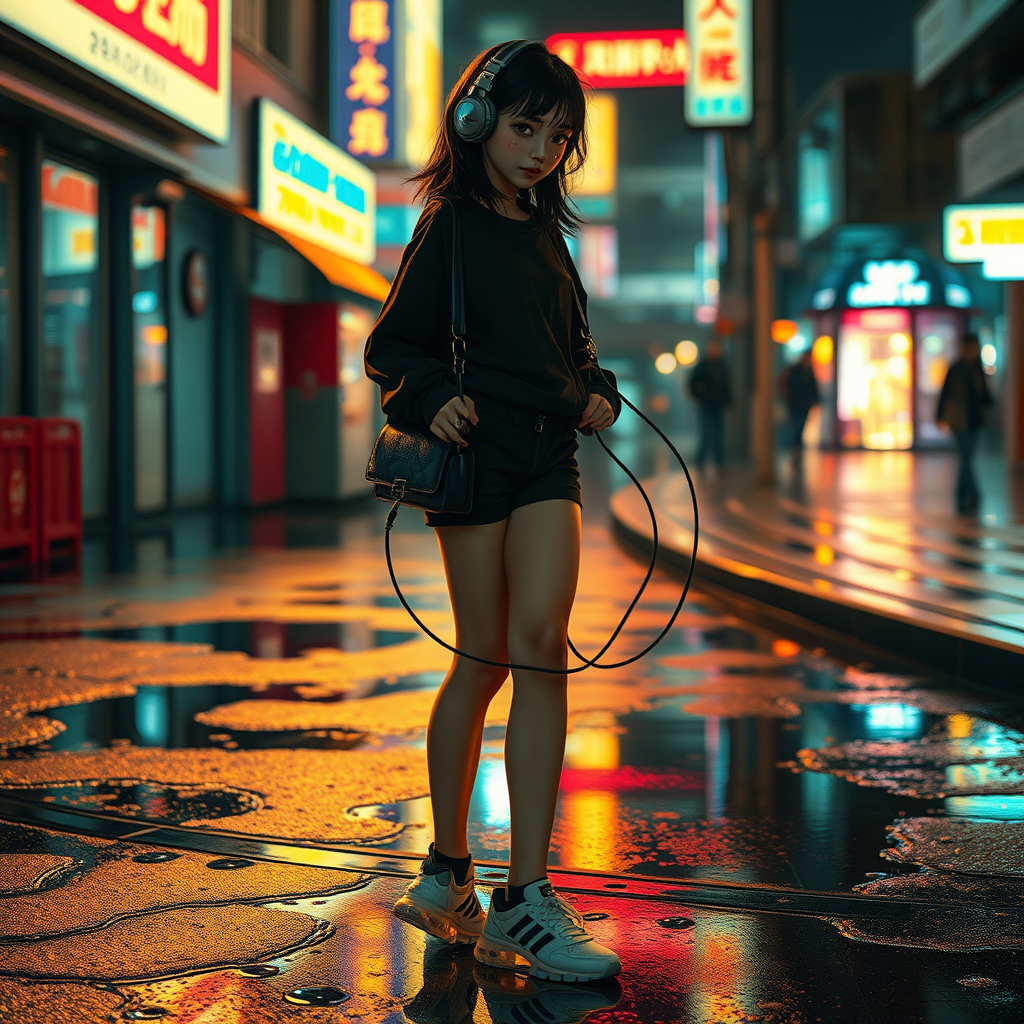 Slender Asian girl in baggy clothes and sneakers, embodying a minimalistic, Tsutomu Nihei-inspired look with an emphasis on clarity and a cyberpunk atmosphere. She is set against a neon-lit background, with puddles reflecting the vibrant lights. Her style combines goth elements with a hyper-detailed, photorealistic approach. Cinematic lighting enhances the scene, creating depth of field that highlights her dynamically waving hair, paired with a sleek women's bag. Her outfit transitions between tight clothes and bare skin, revealing bare legs intertwined with a web of crooked wires. Accessories like headphones and piercings accentuate her slender features. The scene is drenched in blinding light and gold hues, where metallic rivets add symmetry to her form. Despite elements of Gothic surrealism, the portrayal maintains anatomical realism, avoiding mutations or disfigurements. The focus is on the cybernetic allure and the contrast of her narrow hips and high heels against the vibrant cyberpunk landscape.