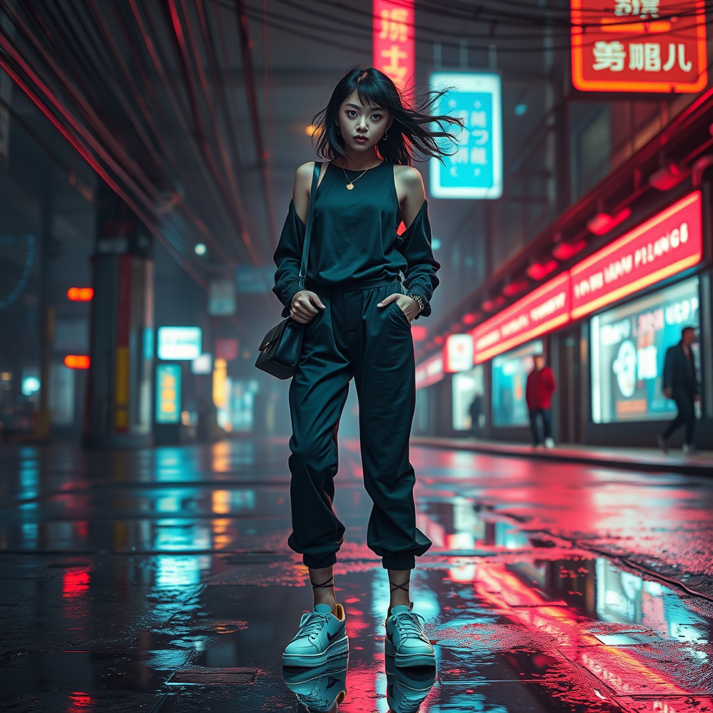 slender Asian girl, stunning in baggy clothes and trousers, wearing sneakers, embracing minimalism with a hint of Tsutomu Nihei's style. The scene is set in a cyberpunk atmosphere with neon-lit backgrounds, reflecting in the puddles. Her ensemble is enhanced with goth-inspired details, showcasing depth of field and hyper-detail, all captured in a photorealistic manner with cinematic lighting. Her hair waves dynamically, while she carries a women's bag, juxtaposing tight and bare elements like her legs and neck against a web of wires. Her silhouette features narrow hips and heels, all beneath a blinding sky. The aesthetic includes gold accents and rivets, maintaining symmetry without distortion. The emphasis is on clarity and quality without negative attributes, ensuring no deformations or irregular proportions. The environment is free from imperfections such as artifacts or blurriness, focusing on capturing a vibrant, lifelike expression.
