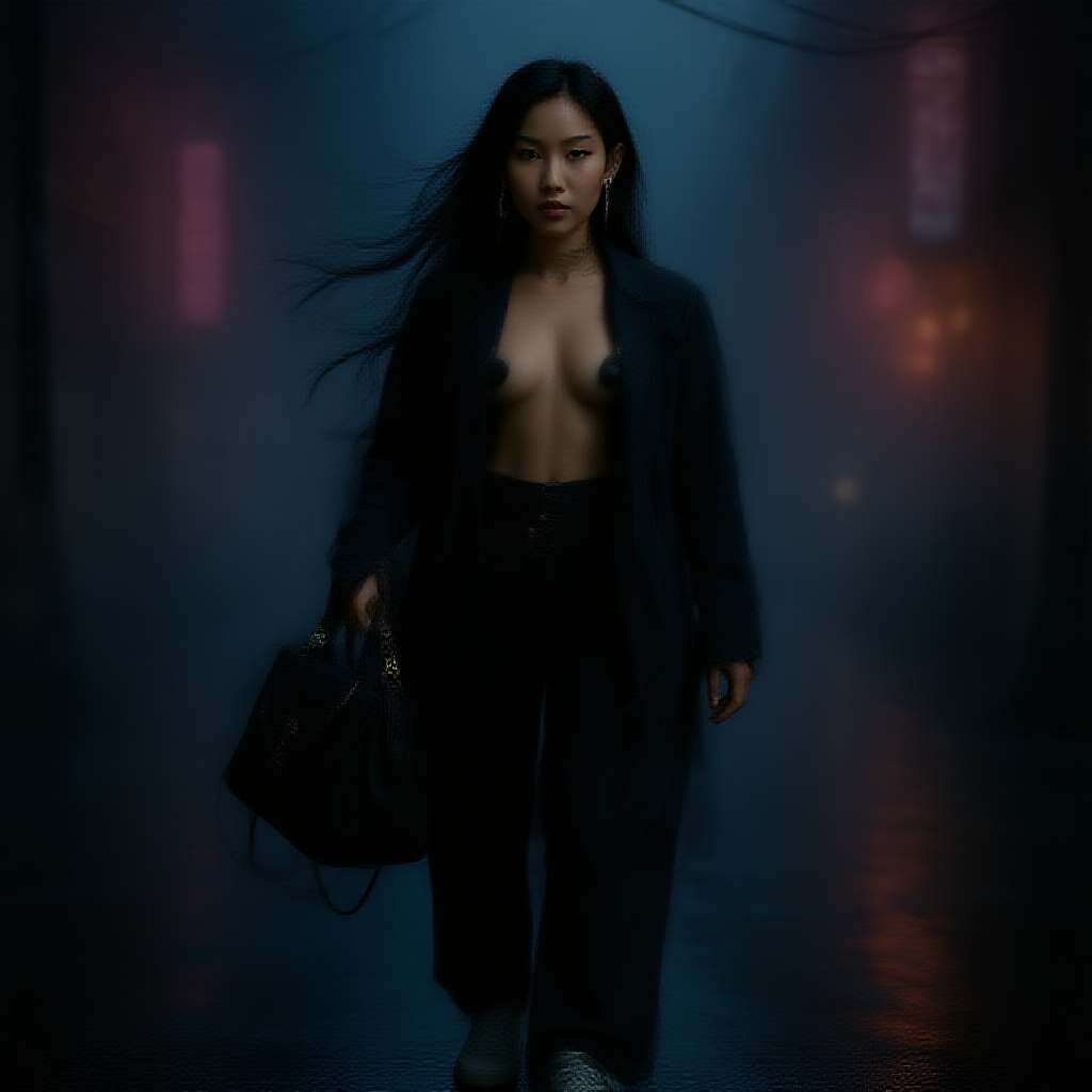 slender Asian girl, stunning in baggy clothes, sneakers, minimalism, inspired by Tsutomu Nihei, cyberpunk atmosphere with neon lights, puddles enhancing the urban glow, goth elements, cinematic depth of field, super detailed and hyper photorealistic. Cinematic lighting highlights dynamically waving hair as she carries a women’s bag. Elements of tight and bare clothing contrast with the sky and a web of wires in the background. Piercings and headphones accentuate her bare neck and slender form, with narrow hips and delicate heels. Gold rivets and symmetry add a touch of elegance. The scene captures a perfect blend of futuristic and edgy aesthetics, avoiding any deformations or awkward anatomy. The atmosphere is gritty yet polished, with no oversaturation or low-quality elements, focusing on a lifelike expression and captivating visuals.