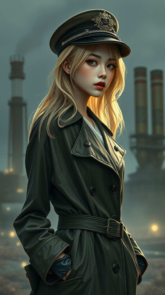 Slender girl in an imperial-style officer's open raincoat adorned with intricate details, showcasing photorealistic loose blonde hair framing a stunning face with Korean makeup. Set in a dieselpunk style, a diesel plant looms in the backdrop, embodying a retro-futuristic vibe with elements of social art. Emphasizing maximum detail, this digital painting captures a vintage atmosphere with hyperphotorealism, utilizing dark colors and complex details in a side view composition. Light emanates from multiple sources, accentuating the realism. The figure stands with hands in pockets, exhibiting a piercing and wearing a detailed headdress. The overall imagery is meticulously crafted to eliminate any imperfections, focusing on perfect anatomy and avoiding poorly drawn features or added limbs.