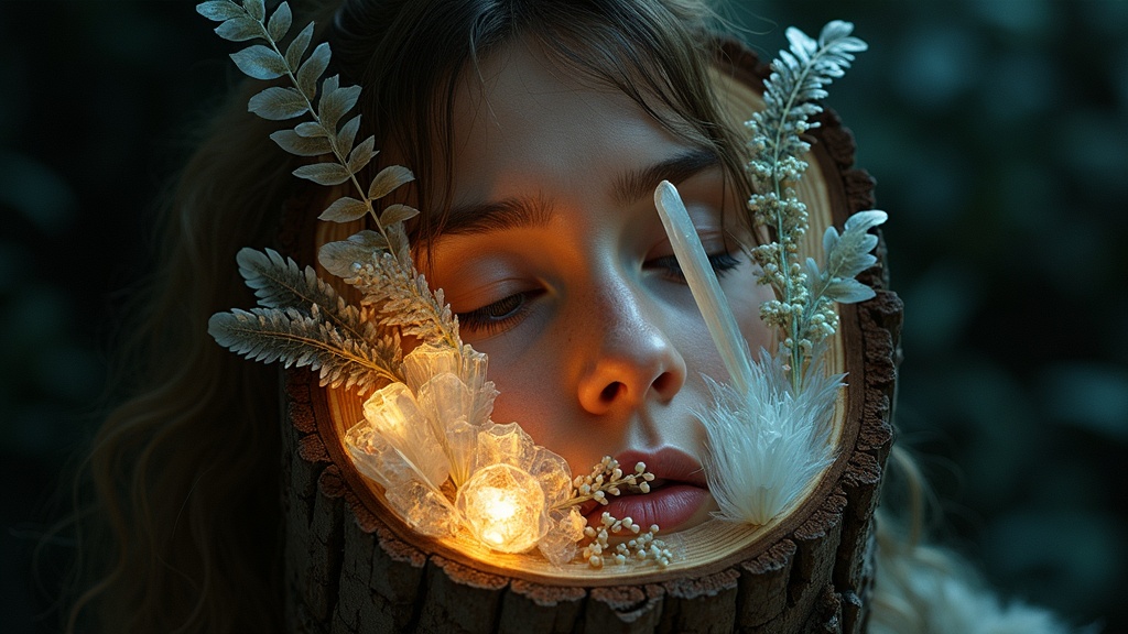 View this AI-generated image featuring a wooden slice crafted from luminescent crystals with a person s face subtly illuminated rendered in surreal fashion photography style featuring intricate feathered elements and nature inspired organic forms the image presents a striking contrast between light