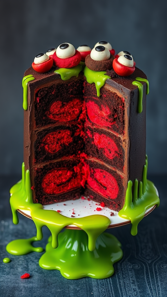 Slicing into the cake reveals an intricate design inspired by the chaotic charm of the critters movie, featuring layers swirled in dark chocolate and vibrant red velvet, resembling the mischievous fur of the iconic creatures, while a green-tinted frosting oozes like their alien goo, topped with edible eyes that seem to watch you as you savor each bite.