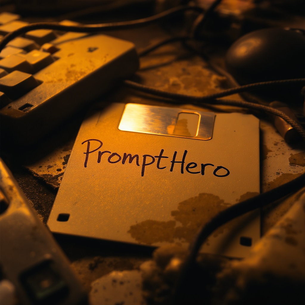 An aged, slightly worn floppy disk with "PromptHero" scribbled in bold black marker, resting against a nostalgic backdrop of retro computer parts; the scene captures a warm, nostalgic feeling in a raw yet vivid style, evoking a sense of history and mystery with a subtle glow reflecting off its surface, set in a cinematic 16:9 aspect ratio.