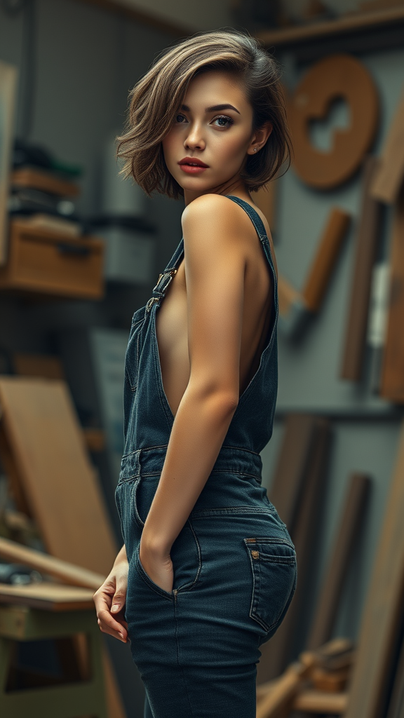 Slim figure, slender build, gazing directly at the viewer, wearing overalls, hint of sideboob, sporting short wavy hair, detailed and intricate features, set in a workshop environment, full of creative energy and subtle nuances.