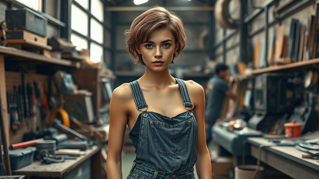 Slim slender figure, gazing directly at the viewer, wearing overalls without a bra, subtle sideboob visible, short wavy hair, detailed and intricate features, set within a busy workshop environment, where an assortment of tools and equipment add a sense of organized chaos and creativity, atmosphere filled with traces of dust and light streaming through high windows illuminating the scene.