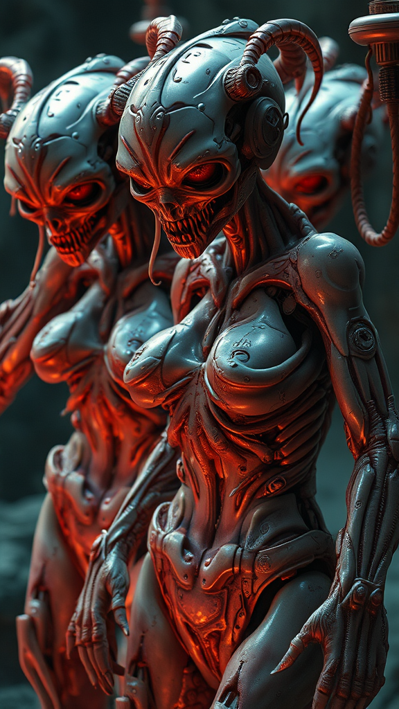 Slimy, eerie female cyborg demons, captured in various full-body poses with highly detailed cinematic backgrounds, heavily inspired by the unsettling aesthetic of H. R. Giger and the imaginative worlds of Jean Ansell and Justin Gerard, alongside the otherworldly horror of H. P. Lovecraft, enhanced with the macro photography precision of Miki Asai. This hyper-detailed scene features a sharp focus and studio-like clarity, showcasing intricate and complex designs. The artwork is trending on ArtStation, with each component meticulously crafted, embodying a surreal fusion of organic and mechanical elements, by the visionary imagination of Greg Rutkowski.