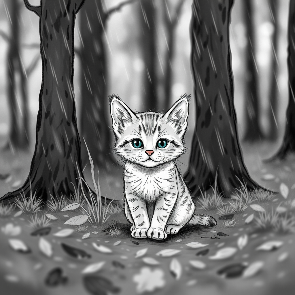 small adorable kitten amidst trees in a rainy forest scene character study tilt-shift effect soft bokeh monochrome sketchy style imperfect form peculiar anatomy unusual limb placement