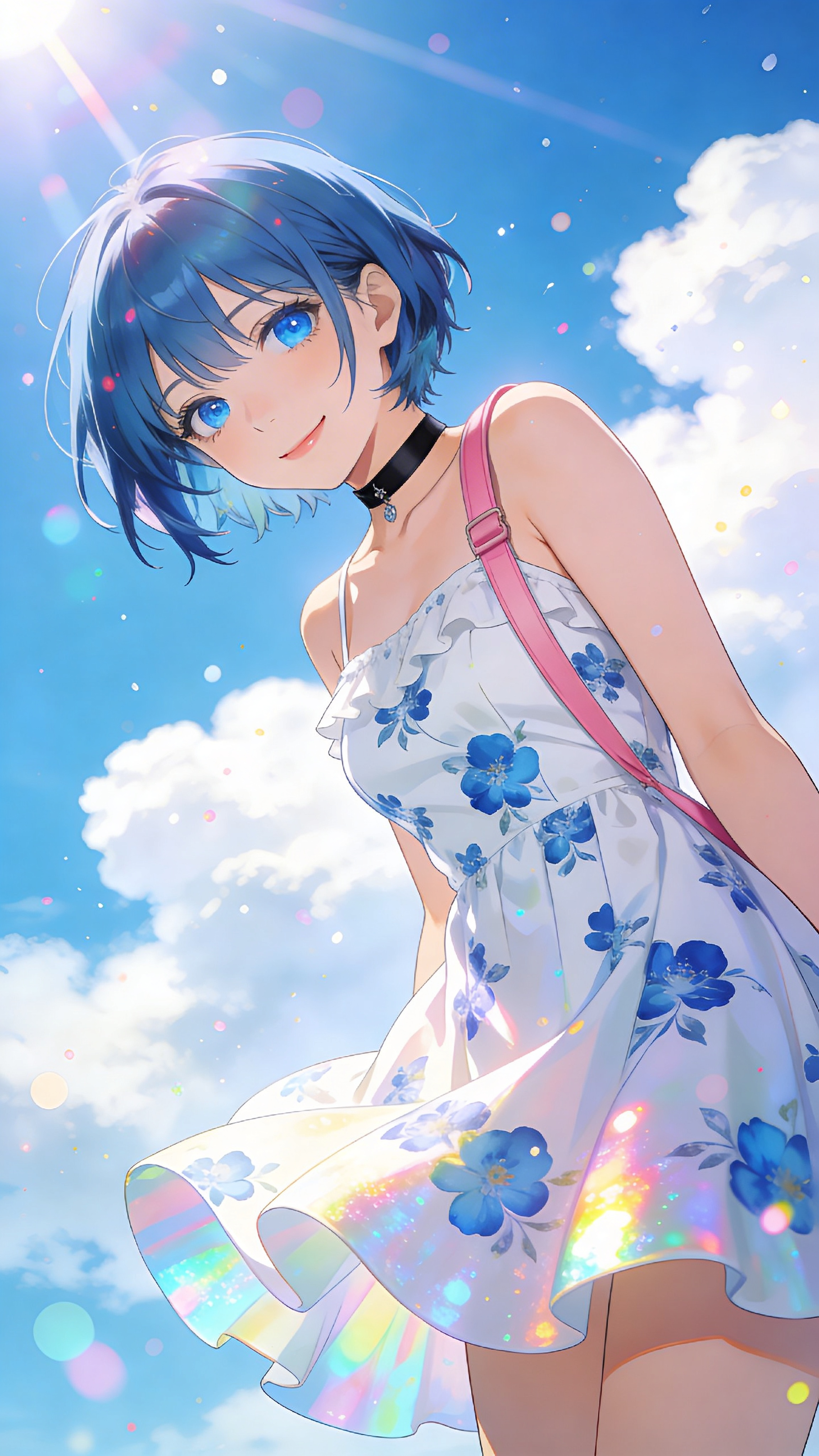 Anime art style, full body portrait of a beautiful young woman with short blue hair and blue eyes, wearing a white sundress with blue floral patterns, a black choker, and a pink shoulder strap, looking down at the viewer with a gentle smile. Upward angle, bright sunny outdoor lighting, lens flare, light rays, shimmering particles, bokeh, iridescent reflections on the dress. Soft, dreamy mood. Vibrant pastel colors, clear blue sky with fluffy white clouds in the background. Highly detailed, intricate, sharp focus.