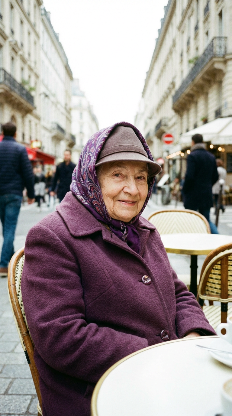 A cheerful elderly woman in a purple coat and patterned headscarf smiles directly at the viewer while seated at an outdoor cafe table. The background shows a bustling European street scene with classic architecture, evoking a charming and candid street photography style.