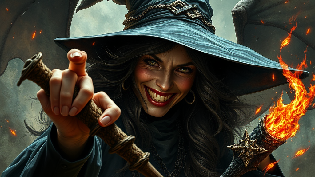 Smiling witch in a breathtaking action scene of vengeance, reminiscent of Eledrae by Taijen 3, portrayed in the style of Alberto Vargas with a polished metamorphosis. Featuring trompe l'œil illusionistic details, the piece blends stripcore elements with dreamlike, otherworldly mystical realism. The composition is unique and ultra-detailed, balancing abstract with representational artistry. Created in Adobe Photoshop, it's inspired and worthy of an award-winning masterpiece.