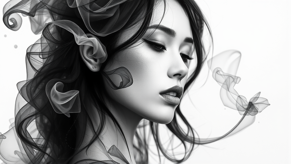 Smoke sculpture portrait of a woman, evoking the essence of fluid fabrics and gentle ink washes, with influences of dance captured in the moment. Inspired by Juliana Nan, featuring the clarity and precision of Mandy Disher, the artwork embodies a sense of movement and effortless spontaneity, rendered in an aspect ratio of 73:106 with a stylistic emphasis of 750.