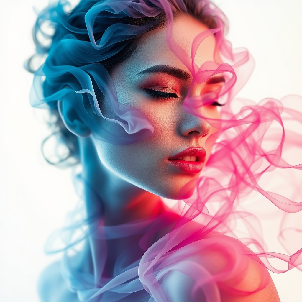 smoke sculpture portrait of a woman, inspired by the elegance of flowing fabrics and delicate ink washes, embodying the grace of dance, infused with the vibrant creativity of juliana nan and the clarity of mandy disher. A fusion of movement and spontaneity is captured in a clear and crisp style, with gentle, swirling patterns and ethereal textures, offering a dynamic portrayal through an aesthetic lens.