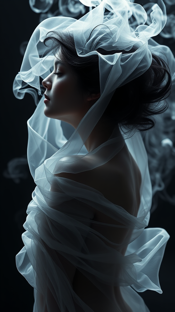 Smoke sculpture portrait of a woman, reminiscent of ethereal fabrics, gentle ink washes, graceful dance, evoking the spirit of Juliana Nan, with the clarity and precision of Mandy Disher, embodying movement and spontaneity captured in an elegant form.