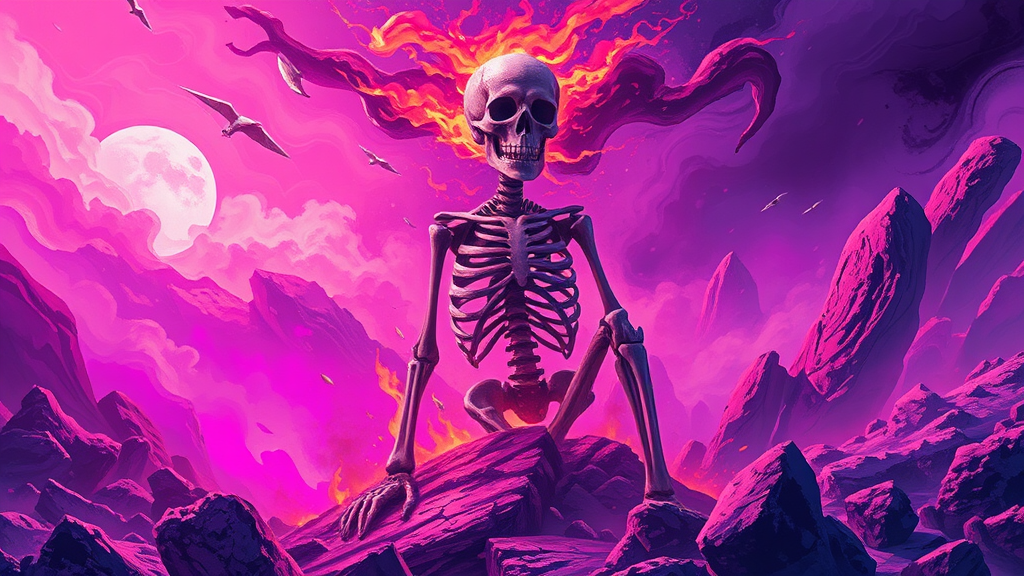 Smoldering skeleton amidst a digital landscape, vibrant mix of purples, pinks, and earthy hues, embodying a modern aesthetic with swirling hues and dynamic contrasts.