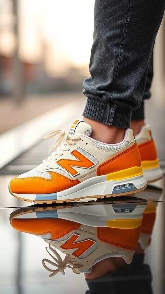 Snapshot, efficient, New Balance 327, ivory and tangerine, lemon, mirror image.