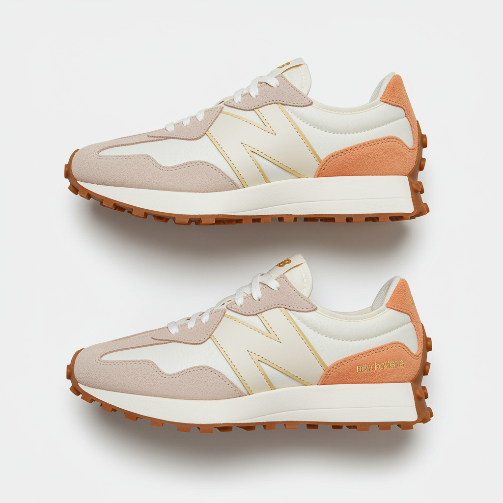 Snapshot, efficient, New Balance 327, ivory and tangerine, golden hue, mirror image.