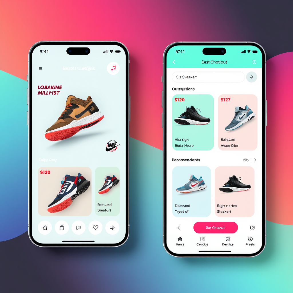 sneaker boutique mobile app layout, user interface emphasizing sleek design, modern style, vibrant color scheme, intuitive navigation, high-quality sneaker images, personalized recommendations, easy checkout process, space-efficient elements