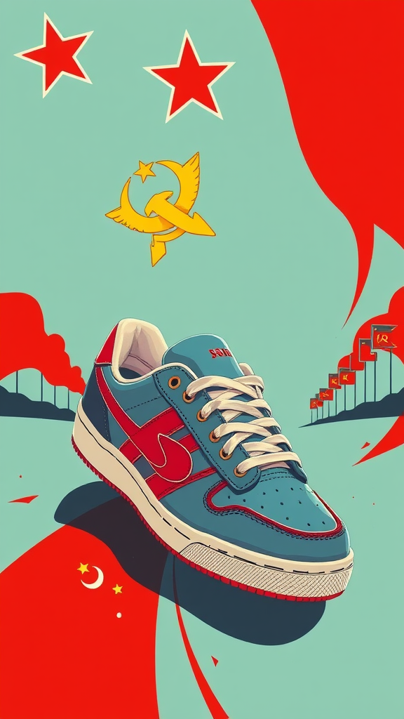 Sneaker design inspired by a Soviet style poster, USSR propaganda style with anime influences, high detail offset printing, vibrant colors, poster quality, 8K resolution, HD, CMYK palette, cheerful expression, natural lighting, creative tweaks maintaining the essence, harmonious blend of classic and modern design elements, emphasizing bold typography and striking imagery, capturing the dynamic spirit and cultural richness of an iconic era, with an artistic twist.