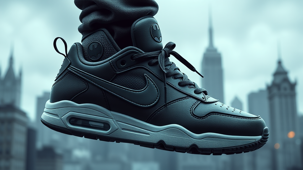 Sneaker design inspired by Batman, Nike collaboration, featuring intricate detailing and high-resolution elements, showcasing a dark, sleek aesthetic fit for a superhero with advanced textures and subtle nods to Gotham City's iconic architecture, crafted in a 4:5 aspect ratio.