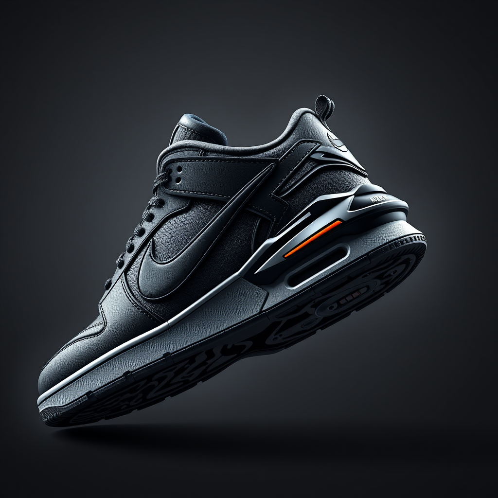 Sneaker design inspired by Nike and Batman, featuring intricate details, rich textures, and a sleek, dark aesthetic reminiscent of the iconic superhero's persona, crafted in ultra-high definition for a visually stunning 8k presentation, maintaining a bold and futuristic appeal.